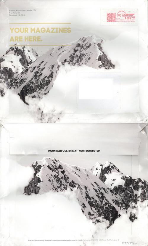 Two issues of Elevated, a mountain culture x snus publication, sent to a General Snus account holder upon request in June 2017. The magazines contain information about winter and summer mountain sports, like skiing and hiking, as well as tobacco retailer highlights and snus facts. Well over a third of each issue are ads for General Snus.
