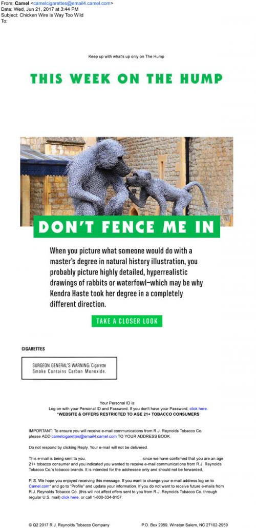 Camel email from June 2017 featuring a recent article from the Hump, a weekly weird spotlight on the brand website.