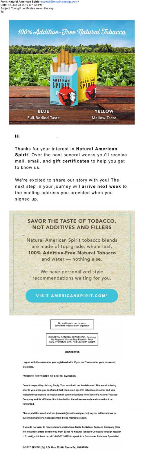 Email from American Spirit in June 2017 letting the recipient know that coupons that were requested are in the mail, and repeating that their products are 100% additive free and natural. Invites the viewer to the brand website to learn more.