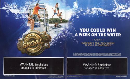 2-page ad promoting Skoal's Floating Holiday sweepstakes; the viewer is invited to the brand website to design a trip for the chance to win.