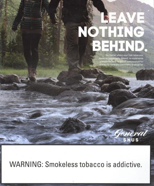 Ad from the General Snus publication Elevation, highlighting the convenient disposable lid on their snus can to store used pouches and uphold the idea of leaving no trash in nature. Image shows a man and woman crossing a stream. Text: "Leave nothing behind."