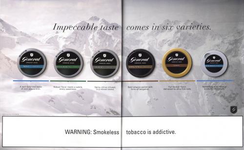 2-page ad from the General Snus publication Elevation, showing the product lineup. Provides descriptions of flavors and styles, including a loose style and smaller dry pouches.