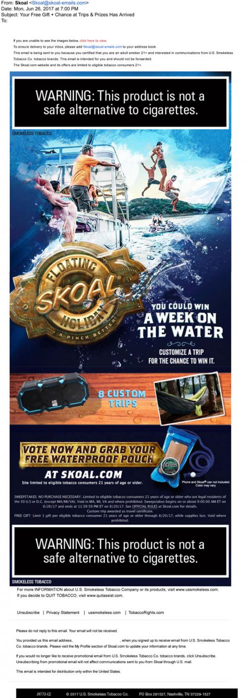 Skoal email from June 2017 promoting the Floating Holiday sweepstakes, where visitors to the brand website are invited to customize a trip for the chance to win. As an added incentive, the email features a free gift of a waterproof pouch for participating, and links to the site to enter.