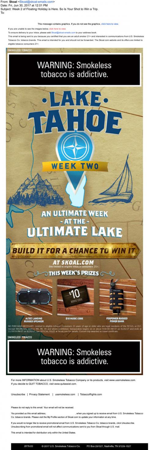 Skoal email from June 2017 promoting the Floating Holiday trip sweepstakes, with an invitation to enter to win on the brand website. Shows images of available prizes to be won in the second week of the giveaway.