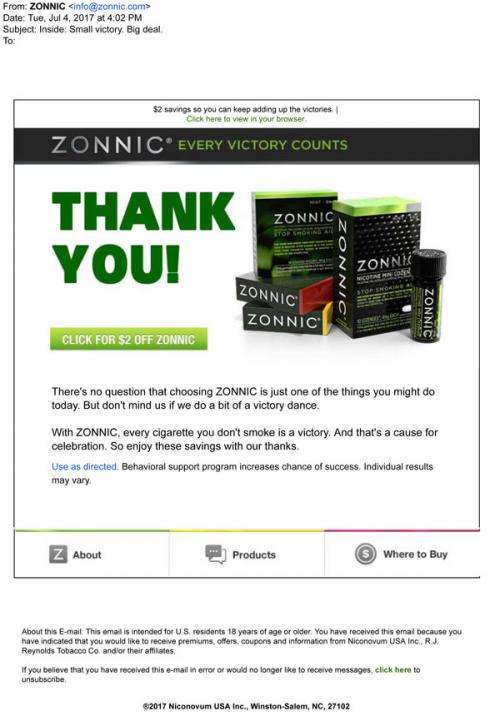 Zonnic email from July 2017 thanking the recipient for signing up for news about the product.