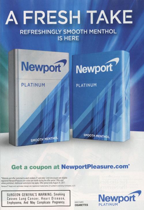 Newport magazine ad for the new Platinum smooth menthol style. Includes an offer for a coupon if you visit the brand website. Text: "A Fresh Take: Refreshingly smooth menthol is here"