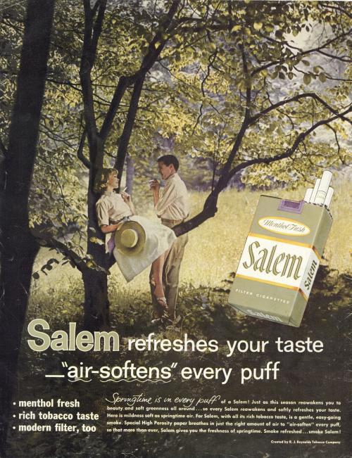 Salem ad with a woman and a man in nature, both smoking. Text: "Salem refreshes your taste- air-softens every puff."