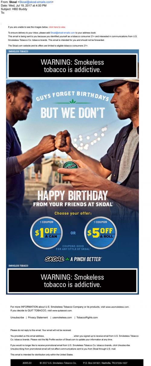 Birthday email from Skoal in July 2017 with the text "Guys forget birthdays, but we don't" and an image of two men giving each other a fistbump. Links to the brand website to claim special coupons for the occasion.