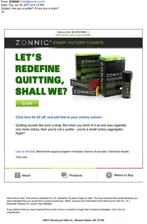 Zonnic email from July 2017 delivering a coupon via a link to the recipient, with a message: "Let's redefine quitting, shall we?"