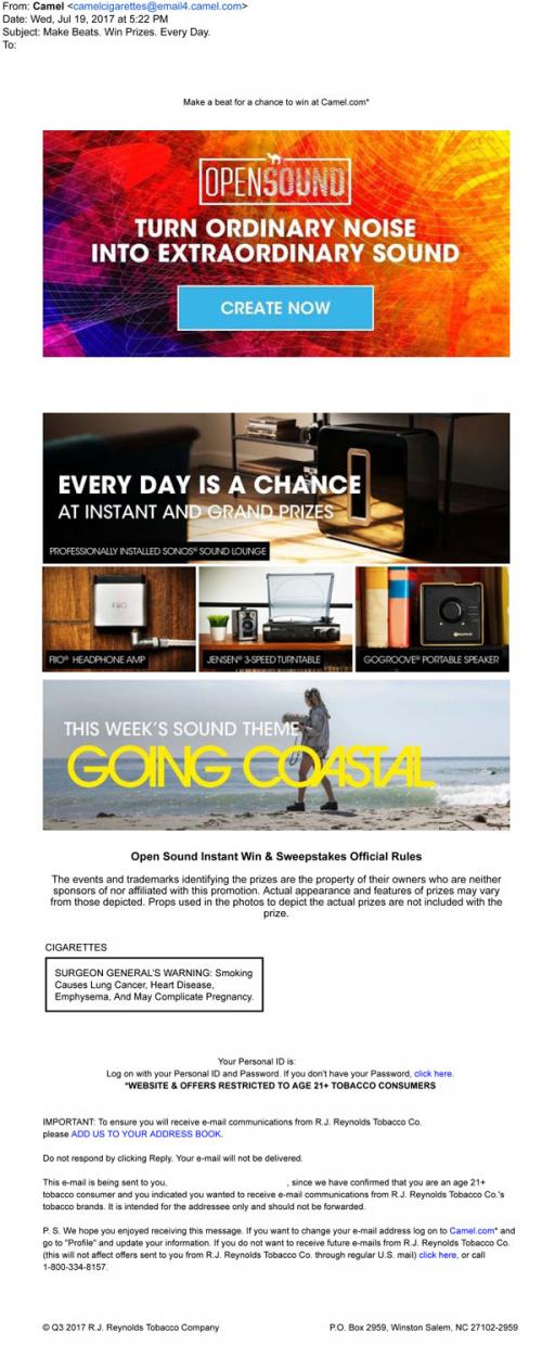 Camel email from July 2017 promoting the Open Sound contest, with a peek at some available prizes and the weekly theme, with a link to the brand website to enter by creating a tune.