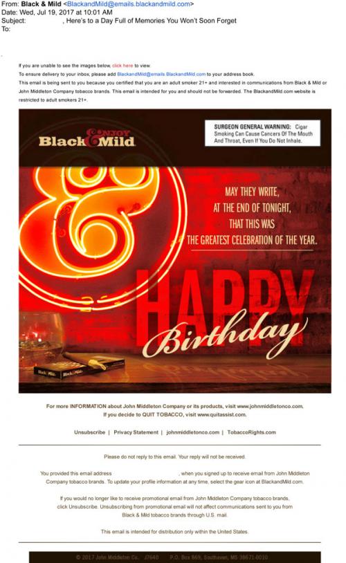 Happy Birthday email from Black & Mild in July 2017.