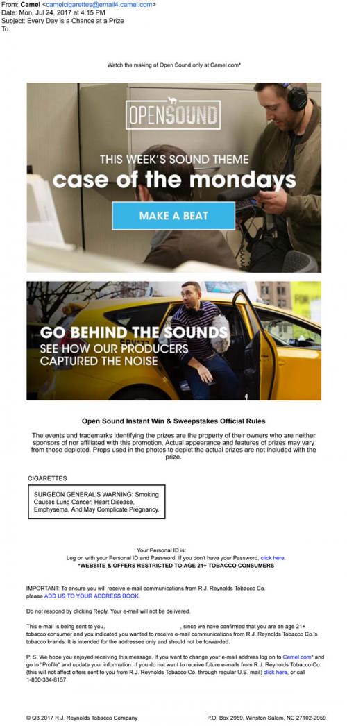Email from Camel in July 2017 promoting the Open Sound sweepstakes, with a behind the scenes feature to check out and a link to the brand website to enter by crafting a beat.