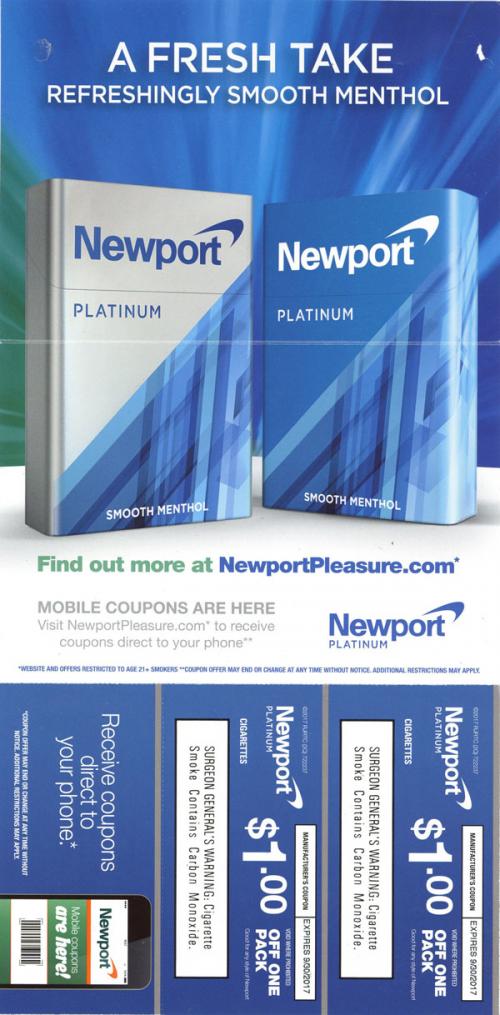 Newport direct mail received in July 2017 that promotes the new Platinum product. Also promotes the availability of mobile coupons sent directly to your phone.