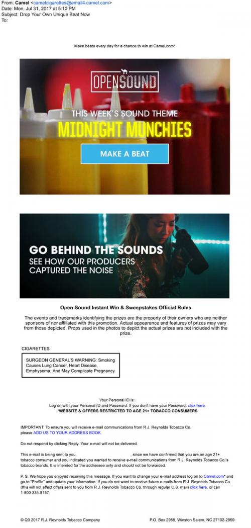 Email from Camel in July 2017 to promote the Open Sound sweepstakes, with links to the brand website to create a beat to enter and check out a behind the scenes feature.