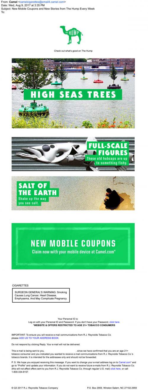 Email from Camel in August 2017 advertising their Hump feature, full of wacky articles. Also promotes the new mobile coupon program which can be accessed on the brand website through a mobile device.