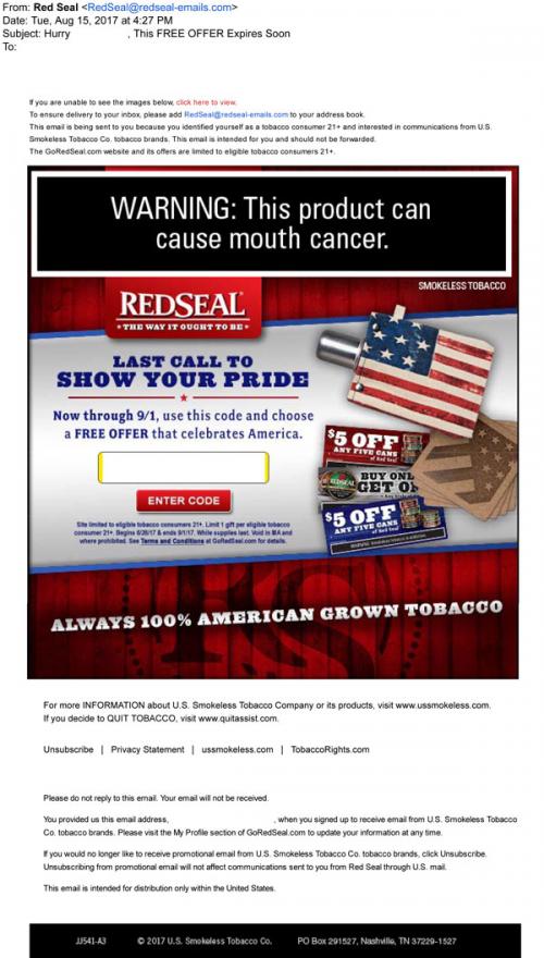 Email from Red Seal in August 2017 with a promotional code for a free gift "that celebrates America," redeemable on the brand website.