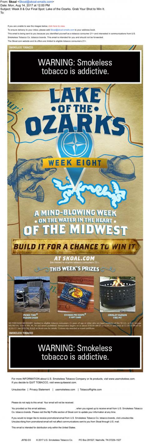 Skoal email from August 2017 promoting the Floating Holiday giveaway with a link to the brand website to enter.