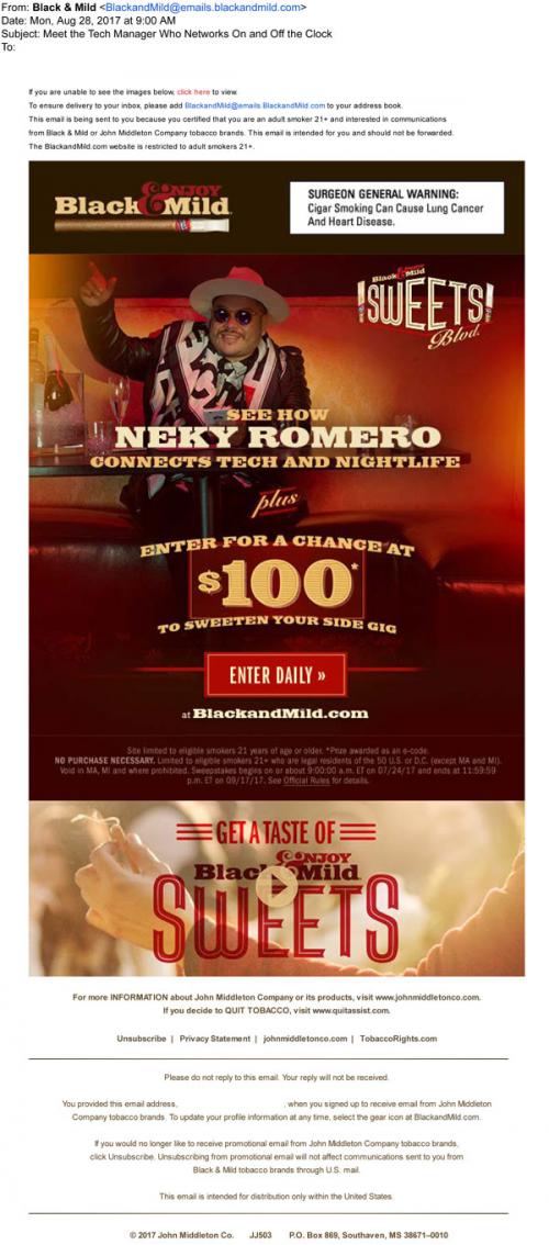 Black & Mild email from August 2017 promoting the Sweets Blvd sweepstakes for a chance to win 100$. Links to the brand website to enter, check out the story of one of their entrepreneurs, and learn more about their sweets cigars.