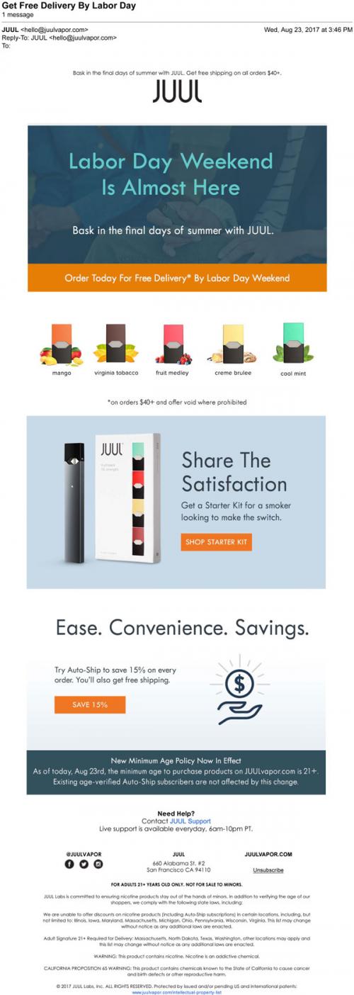 JUUL email from August 2017 inviting the recipient to "bask in the final days of summer" with the brand and order shipments in time for Labor Day. Shows the brand's flavor lineup and promotes their starter pack for "a smoker looking to make the switch." Also promotes their autoship program for savings and includes a reminder about the change in policy for age verification through the website and online store.