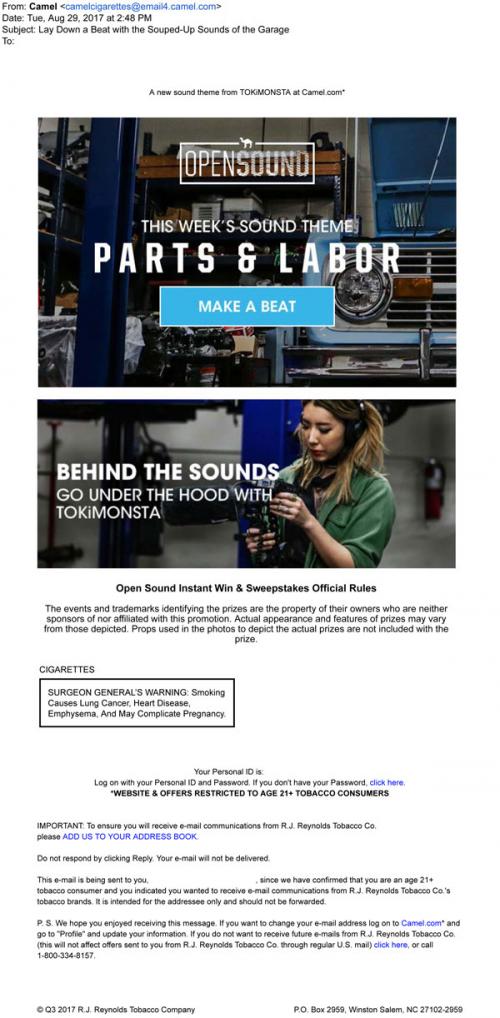 Camel email from August 2017 promoting the Open Sound project, with links to the brand website to make a tune and enter, and check out a behind the scenes video.
