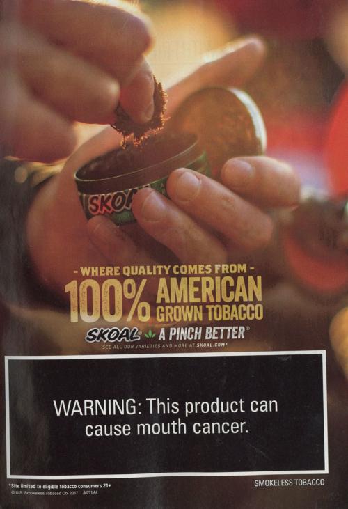 Magazine ad from Skoal that shows a hand with a pinch of dip. Text: "Where quality comes from"