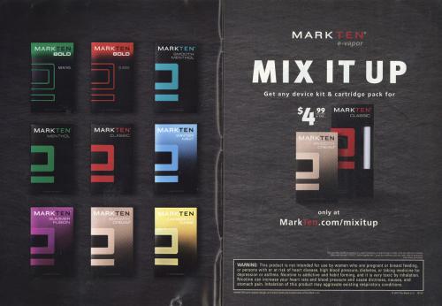 2 page magazine ad for MarkTen with the ad copy "Mix It Up," inviting the viewer to go online for a special bundle price through the brand website. Shows the lineup of flavor and style choices, including the Bold cartridge options, on the other page.