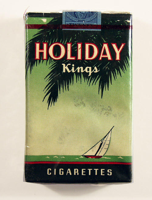 Holiday Kings Cigarettes with coupon on back. Redeemable for articles listed in premium catalog. Larus & Brothers Company Inc. Illinois tax stamp and larger blue tax stamp.