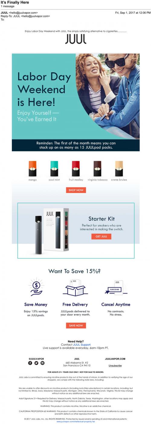 Labor Day email greetings from JUUL in September 2017. Shows the lineup of flavors and promotes the starter kit product, as well as the discount on autoshipping orders.