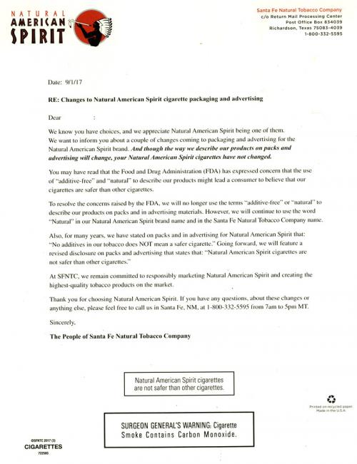 Direct mail from American Spirit received in September 2017 detailing the changes that will be made to NAS packaging and advertising. Describes the FDA ban on phrases like "additive free" and "natural" and how it will affect the brand going forward. Includes the new revised disclosure that the brand will be using: "Natural American Spirit cigarettes are not safer than other cigarettes."