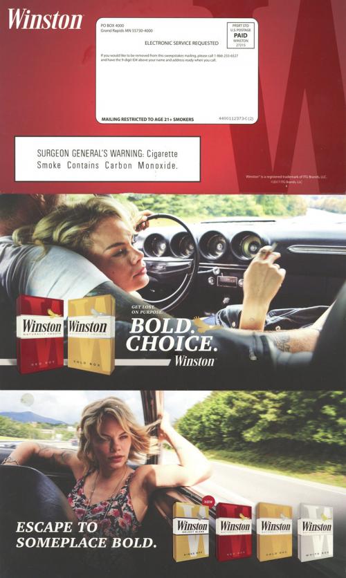 Direct mail from Winston received in September 2017 with the message "Escape to someplace bold." Contains information about the Bold Spin sweepstakes and includes coupons.