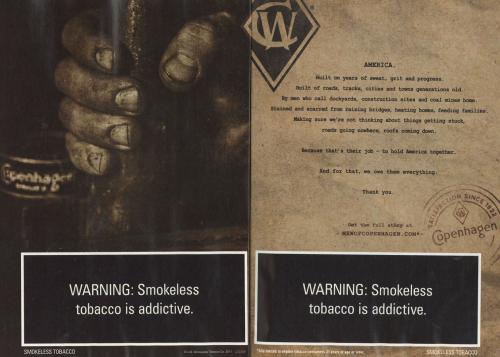 2 page Copenhagen a celebrating the Men of Copenhagen and thanking them for their blue collar work. This version of the ad includes a dirty hand and a can of product.