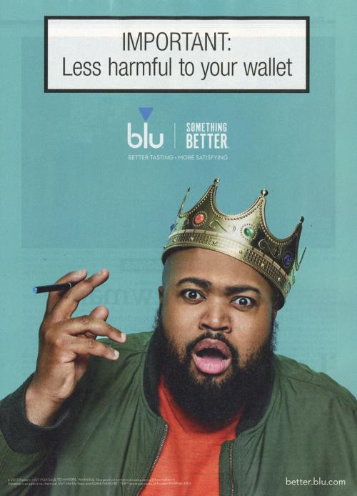 Ad for blu from the Something Better series with the fake warning label "IMPORTANT: Less harmful to your wallet." Also includes the copy "Better tasting" and "More satisfying"