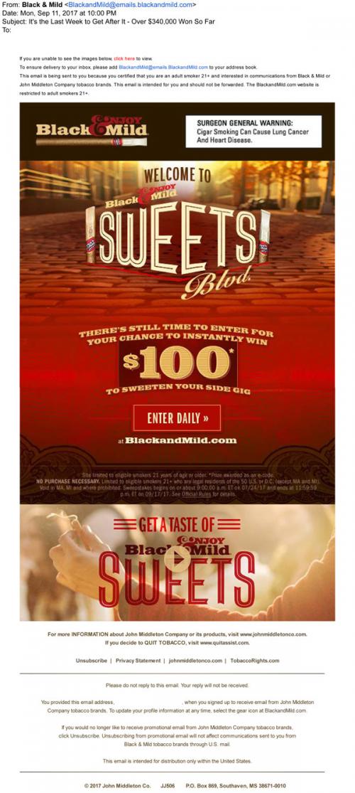 Black & Mild email from September 2017 announcing the last week of the Sweets Blvd giveaway, linking to the brand website to enter and win. Also links to learn more about their sweets cigars.