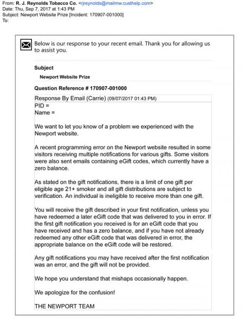 Email from Newport customer service in September 2017 explaining a recent website error that may have resulted in customers receiving notifications of having won multiple gifts. Apologizes for any confusion.
