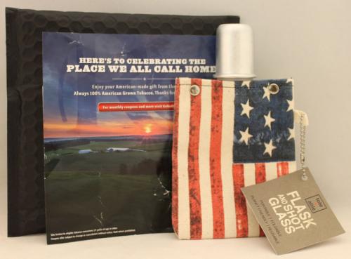 Direct mail gift from Red Seal as requested on the brand website, that arrived in September 2017. Packaged in a black mailer, this "American-made gift" consists of a collapsible canvas flask and shot glass with an American flag motif. An included card thanks the recipient for choosing the brand.