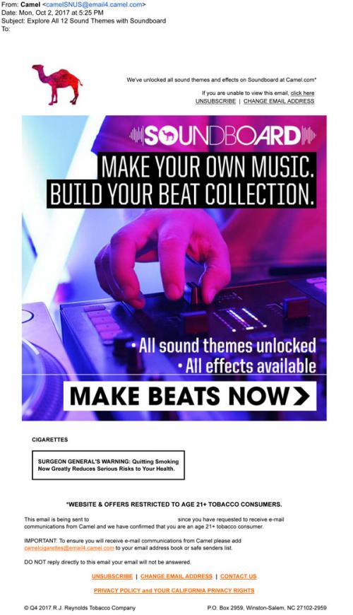 Camel email from October 2017 announcing the unlocked soundboard from the recent Open Sound sweepstakes; the recipient is invited to make some beats on the brand website.
