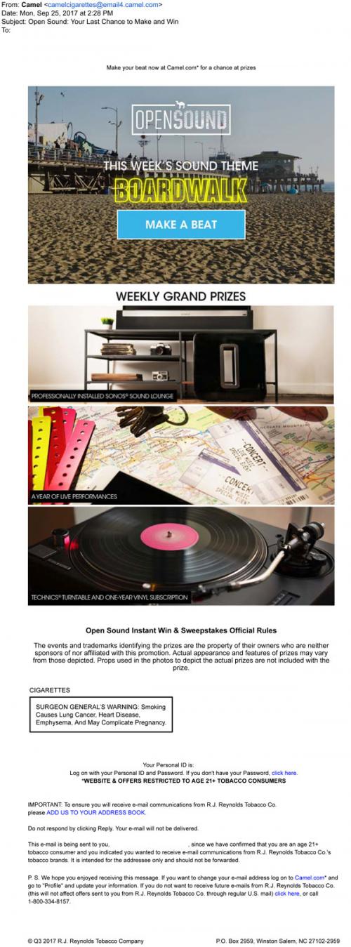 Email from Camel in September 2017 promoting the last chance to enter the Open Sound sweepstakes by making a beat; links to the brand website to proceed. Also shows images for some music-themed prizes to be won.