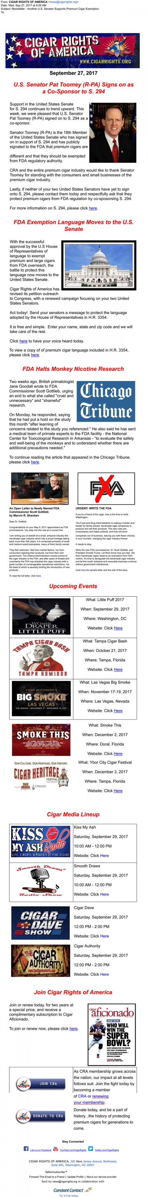 Email from the Cigar Rights of America in September 2017 with an update on FDA language exemptions for premium cigars in the Senate. Links to ways to contact representatives and learn more about the bills. Includes instructions to contact the FDA as well. Also links to upcoming events and cigar media, as well as solicits for memberships and donations.