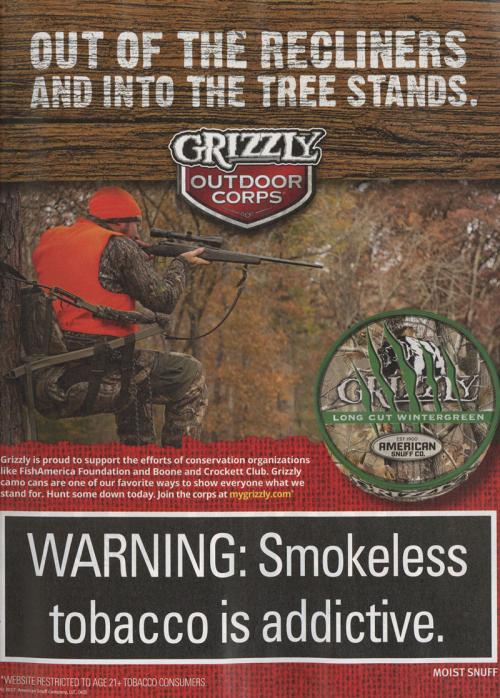 Grizzly magazine ad promoting the Outdoor Corps and the new camo cans, with a message about supporting conservation organizations like FishAmerica Foundation and Boone and Crockett Club. Shows the image of a man hunting from a tree stand. Text: "Out of the recliners and into the tree stands."