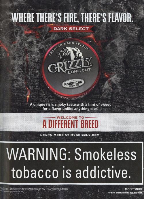 Magazine ad promoting Grizzly's new Dark Select product style, inviting the viewer to learn more on the brand website. The product is described as "a unique rich, smoky taste with a hint of sweet for a flavor unlike anything else." Text: "Where there's fire, there's flavor."