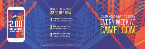 Direct mail from Camel received in November 2017 that has instructions for claiming mobile coupons with your phone through the brand website. Also includes coupons.
