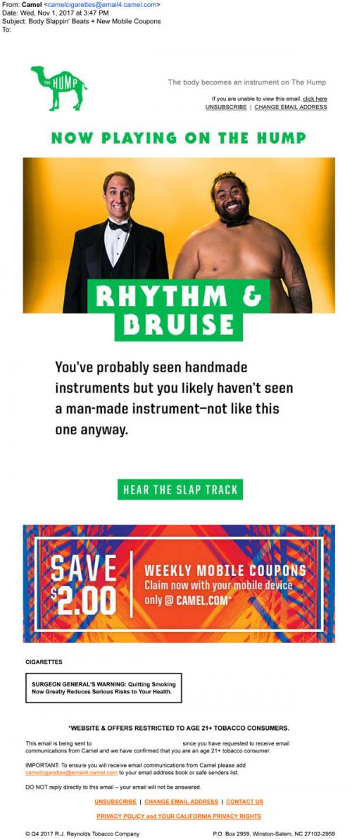 Email from Camel in November 2017 with a new article about body instruments from the Hump weekly feature; also promotes the weekly mobile coupons available to be claimed.