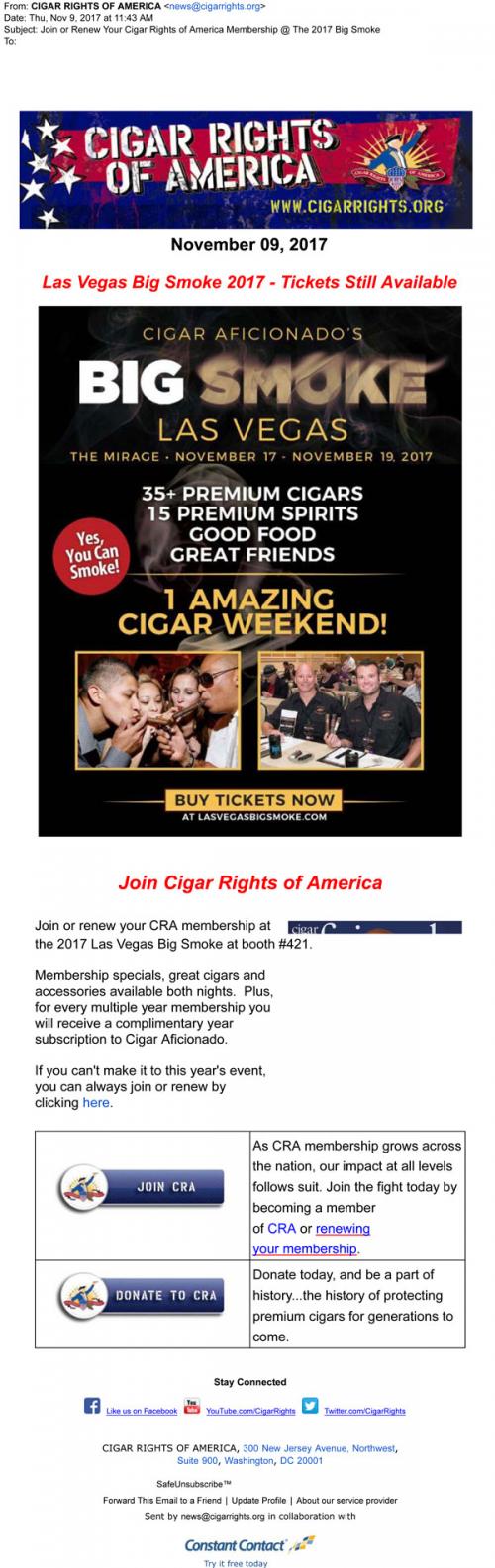 Email from the Cigar Rights of America in November 2017 promoting the next Big Smoke even in Las Vegas. Links to buy tickets, and also solicits for donations and memberships to the organization.