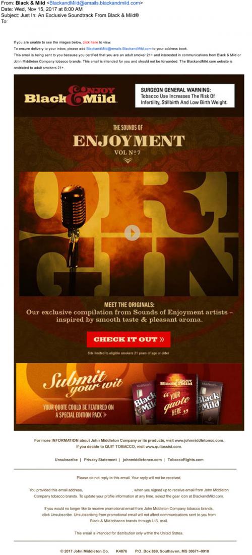 Email from Black & Mild in November 2017 promoting a musical compilation featuring Sounds of Enjoyment artists sponsored by the brand. Links to the brand website to check it out. Also invites the recipient to participate and "submit your wit" for the chance to be featured on special edition brand packaging.