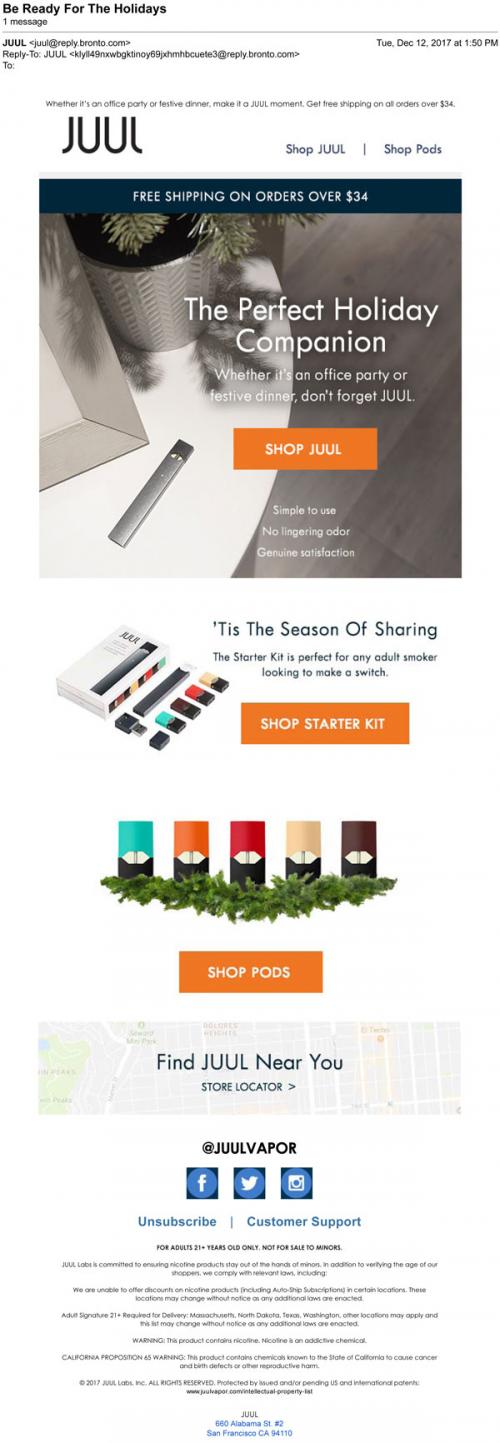 Email from JUUL in December 2017 promoting their products as "the perfect holiday companion" and a great gift idea for smokers looking to switch. Links to the brand website to shop online or use the store locator.