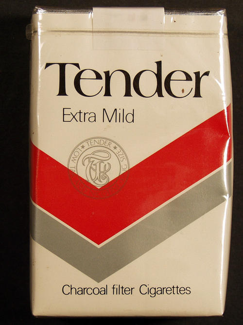 Tender Extra Mild low tar and nicotine charcoal filter cigarettes. Asian writing may be Surgeon General's warning.