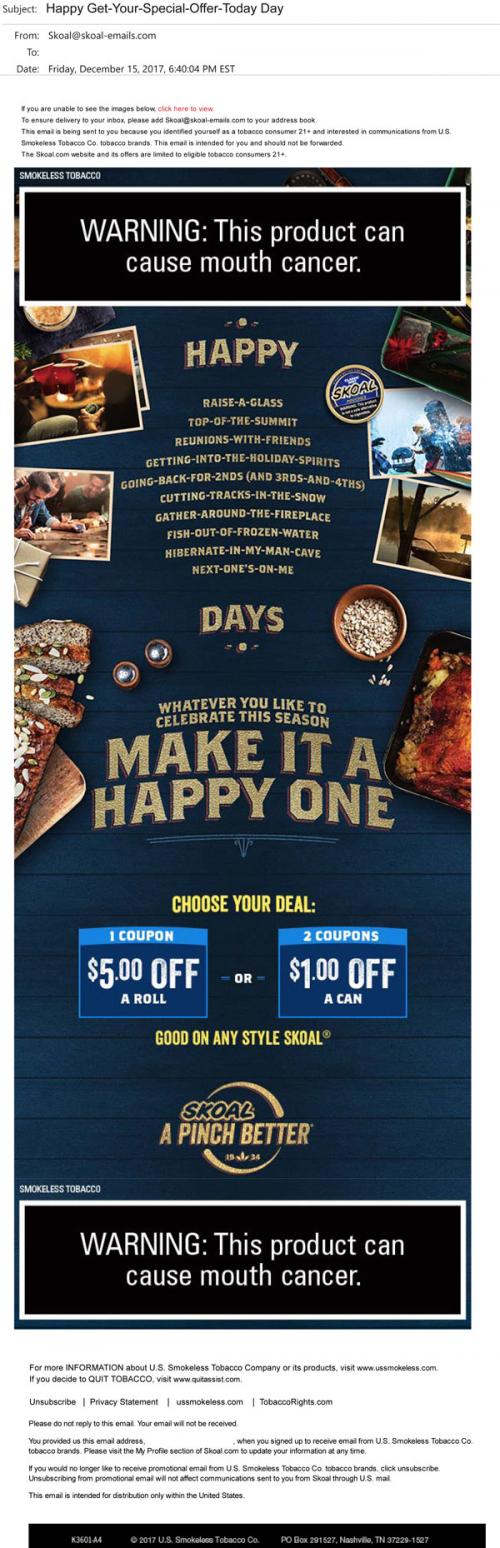 Email from Skoal in December 2017 wishing the recipient a happy "whatever you like to celebrate this season" days, with a link to claim a coupon offer on the brand website.