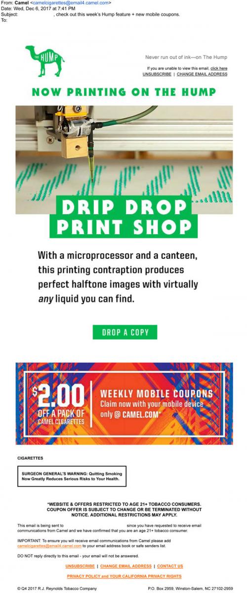 Camel email from December 2017 linking to a new wacky article from the weekly Hump feature on the brand website. Also promotes the weekly mobile coupons that can be claimed.