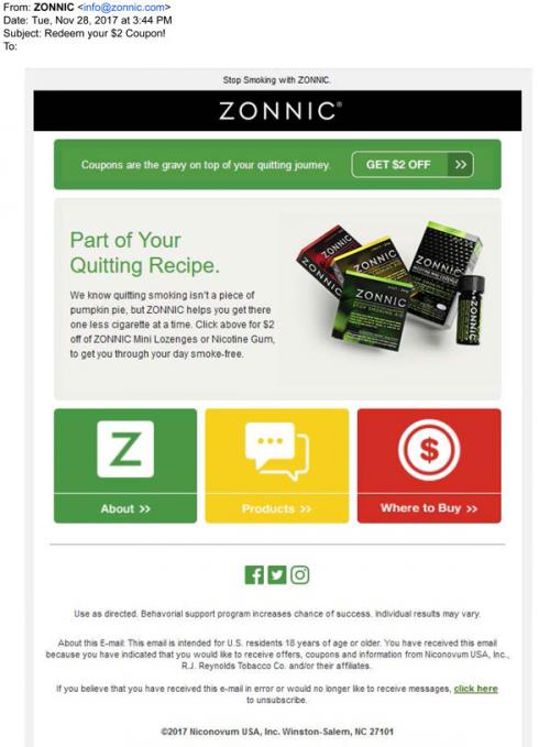 Zonnic email with a Thanksgiving-themed twist received in November 2017 that links to claim a coupon, "the gravy on top of your quitting journey."
