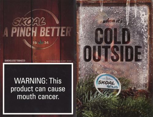 Direct mail from Skoal received in December 2017 that reads "When it's cold outside you can always stay in with Skoal Snus." Has images of men and women playing indoor table games in a bar. Ad copy highlights the versatility of their smokeless products. Includes coupons.